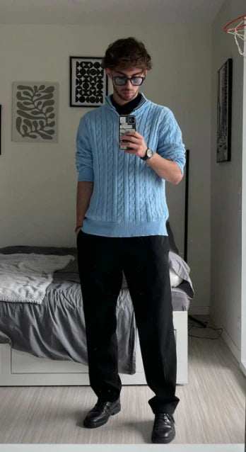 Experience comfort and old money style with our Men's High Collar Half-Zip Sweater Fontaine. Perfect for colder days, this sweater combines elegance with a cable-knit design and sophistication, becoming an essential piece for various occasions from formal to casual.